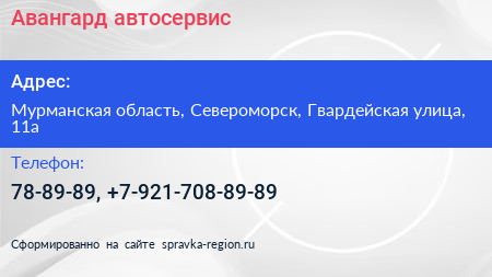 Авангард, автосервис по адресу Мурманская область, Североморск, Гвардейская улица, 11а в дальнейшем Организация, размещена в следующих категориях: