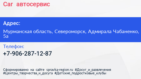 Car+, автосервис по адресу Мурманская область, Североморск, Адмирала Чабаненко, 5а в дальнейшем Организация, размещена в следующих категориях: