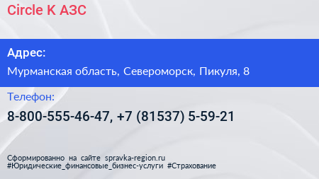 Circle K, АЗС по адресу Мурманская область, Североморск, Пикуля, 8 в дальнейшем Организация, размещена в следующих категориях: