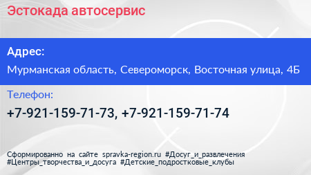 Эстокада, автосервис по адресу Мурманская область, Североморск, Восточная улица, 4Б в дальнейшем Организация, размещена в следующих категориях: