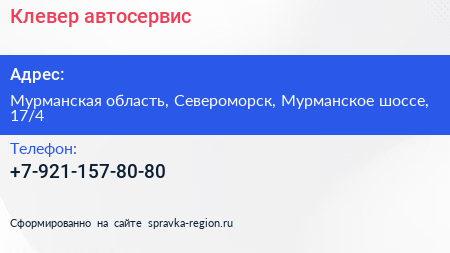 Клевер, автосервис по адресу Мурманская область, Североморск, Мурманское шоссе, 17/4 в дальнейшем Организация, размещена в следующих категориях: