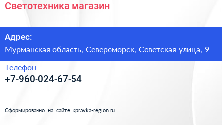 Светотехника, магазин по адресу Мурманская область, Североморск, Советская улица, 9 в дальнейшем Организация, размещена в следующих категориях:
