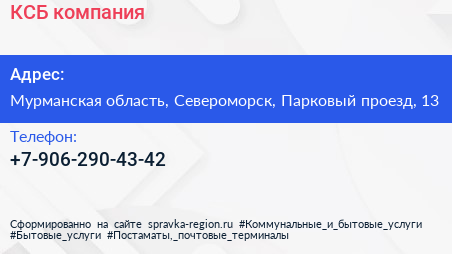 КСБ, компания по адресу Мурманская область, Североморск, Парковый проезд, 13 в дальнейшем Организация, размещена в следующих категориях: