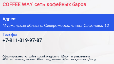 COFFEE WAY, сеть кофейных баров по адресу Мурманская область, Североморск, улица Сафонова, 12 в дальнейшем Организация, размещена в следующих категориях: