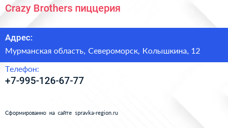 Crazy Brothers, пиццерия по адресу Мурманская область, Североморск, Колышкина, 12 в дальнейшем Организация, размещена в следующих категориях: