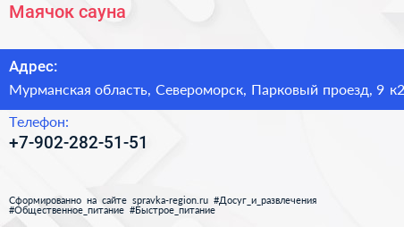 Маячок, сауна по адресу Мурманская область, Североморск, Парковый проезд, 9 к2 в дальнейшем Организация, размещена в следующих категориях: