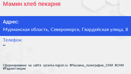 Мамин хлеб, пекарня по адресу Мурманская область, Североморск, Гвардейская улица, 8 в дальнейшем Организация, размещена в следующих категориях: