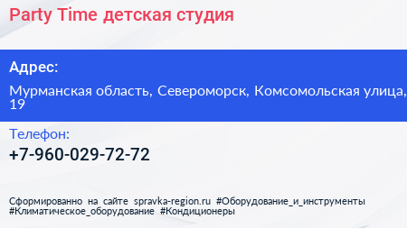 Party Time, детская студия по адресу Мурманская область, Североморск, Комсомольская улица, 19 в дальнейшем Организация, размещена в следующих категориях: