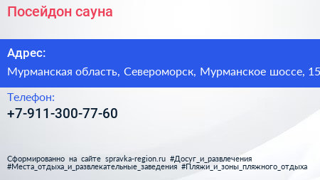 Посейдон, сауна по адресу Мурманская область, Североморск, Мурманское шоссе, 15 в дальнейшем Организация, размещена в следующих категориях: