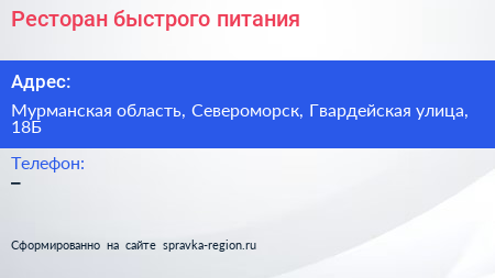 Ресторан быстрого питания по адресу Мурманская область, Североморск, Гвардейская улица, 18Б в дальнейшем Организация, размещена в следующих категориях: