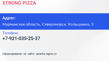 STRONG PIZZA по адресу Мурманская область, Североморск, Колышкина, 3 в дальнейшем Организация, размещена в следующих категориях: