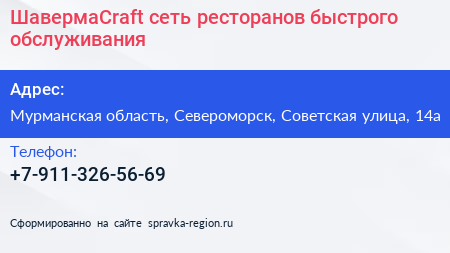 #ШавермаCraft, сеть ресторанов быстрого обслуживания по адресу Мурманская область, Североморск, Советская улица, 14а в дальнейшем Организация, размещена в следующих категориях: