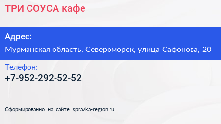 ТРИ СОУСА, кафе по адресу Мурманская область, Североморск, улица Сафонова, 20 в дальнейшем Организация, размещена в следующих категориях: