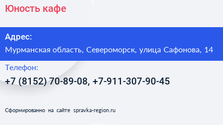 Юность, кафе по адресу Мурманская область, Североморск, улица Сафонова, 14 в дальнейшем Организация, размещена в следующих категориях: