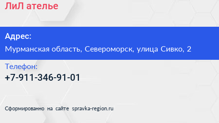 ЛиЛ, ателье по адресу Мурманская область, Североморск, улица Сивко, 2 в дальнейшем Организация, размещена в следующих категориях: