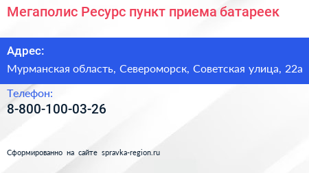 Мегаполис Ресурс, пункт приема батареек по адресу Мурманская область, Североморск, Советская улица, 22а в дальнейшем Организация, размещена в следующих категориях: