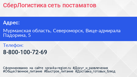 СберЛогистика, сеть постаматов по адресу Мурманская область, Североморск, Вице-адмирала Падорина, 5 в дальнейшем Организация, размещена в следующих категориях: