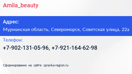 Amila_beauty по адресу Мурманская область, Североморск, Советская улица, 22а в дальнейшем Организация, размещена в следующих категориях: