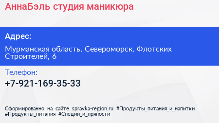 АннаБэль, студия маникюра по адресу Мурманская область, Североморск, Флотских Строителей, 6 в дальнейшем Организация, размещена в следующих категориях: