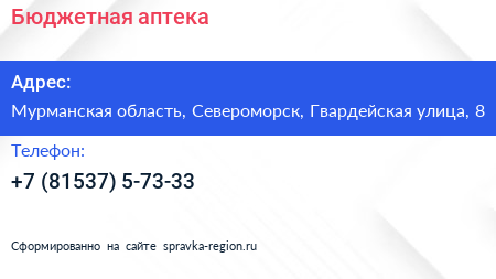 Бюджетная, аптека по адресу Мурманская область, Североморск, Гвардейская улица, 8 в дальнейшем Организация, размещена в следующих категориях: