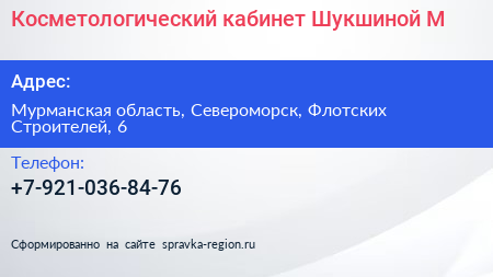 Косметологический кабинет Шукшиной М. по адресу Мурманская область, Североморск, Флотских Строителей, 6 в дальнейшем Организация, размещена в следующих категориях: