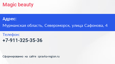 Magic beauty по адресу Мурманская область, Североморск, улица Сафонова, 4 в дальнейшем Организация, размещена в следующих категориях: