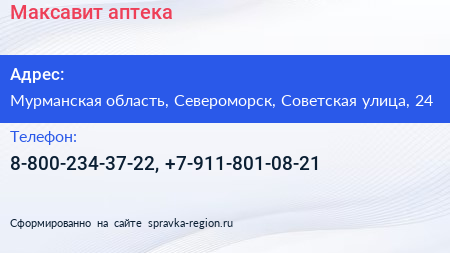 Максавит, аптека по адресу Мурманская область, Североморск, Советская улица, 24 в дальнейшем Организация, размещена в следующих категориях:
