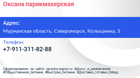 Оксана, парикмахерская по адресу Мурманская область, Североморск, Колышкина, 3 в дальнейшем Организация, размещена в следующих категориях:
