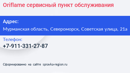 Oriflame, сервисный пункт обслуживания по адресу Мурманская область, Североморск, Советская улица, 21а в дальнейшем Организация, размещена в следующих категориях: