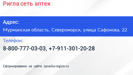 Ригла, сеть аптек по адресу Мурманская область, Североморск, улица Сафонова, 22 в дальнейшем Организация, размещена в следующих категориях: