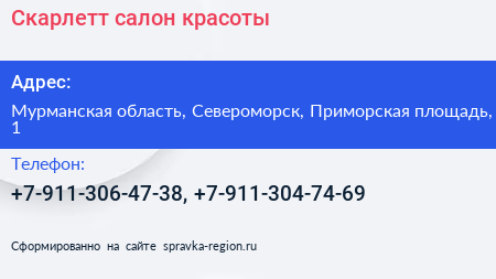 Скарлетт, салон красоты по адресу Мурманская область, Североморск, Приморская площадь, 1 в дальнейшем Организация, размещена в следующих категориях: