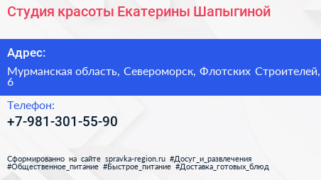Студия красоты Екатерины Шапыгиной по адресу Мурманская область, Североморск, Флотских Строителей, 6 в дальнейшем Организация, размещена в следующих категориях: