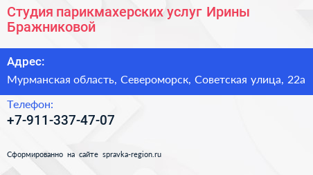Студия парикмахерских услуг Ирины Бражниковой по адресу Мурманская область, Североморск, Советская улица, 22а в дальнейшем Организация, размещена в следующих категориях: