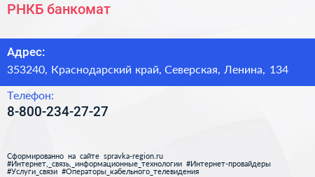 РНКБ, банкомат по адресу 353240, Краснодарский край, Северская, Ленина, 134 в дальнейшем Организация, размещена в следующих категориях: