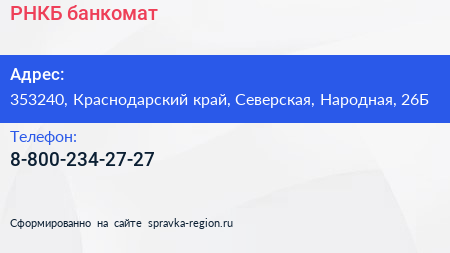 РНКБ, банкомат по адресу 353240, Краснодарский край, Северская, Народная, 26Б в дальнейшем Организация, размещена в следующих категориях: