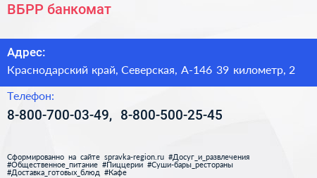 ВБРР, банкомат по адресу Краснодарский край, Северская, А-146 39 километр, 2 в дальнейшем Организация, размещена в следующих категориях: