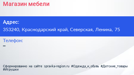 Магазин мебели по адресу 353240, Краснодарский край, Северская, Ленина, 75 в дальнейшем Организация, размещена в следующих категориях: