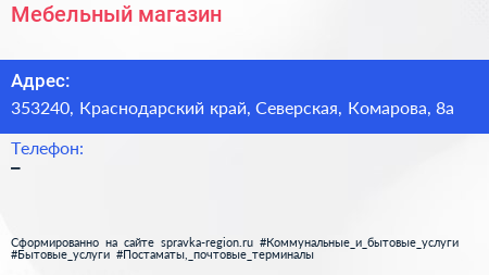 Мебельный магазин по адресу 353240, Краснодарский край, Северская, Комарова, 8а в дальнейшем Организация, размещена в следующих категориях: