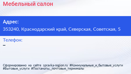 Мебельный салон по адресу 353240, Краснодарский край, Северская, Советская, 5 в дальнейшем Организация, размещена в следующих категориях: