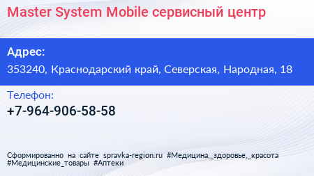 Master System Mobile, сервисный центр по адресу 353240, Краснодарский край, Северская, Народная, 18 в дальнейшем Организация, размещена в следующих категориях:
