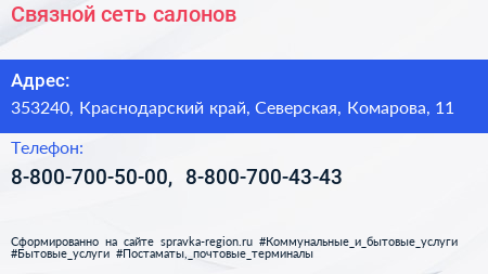 Связной, сеть салонов по адресу 353240, Краснодарский край, Северская, Комарова, 11 в дальнейшем Организация, размещена в следующих категориях: