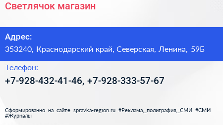 Светлячок, магазин по адресу 353240, Краснодарский край, Северская, Ленина, 59Б в дальнейшем Организация, размещена в следующих категориях: