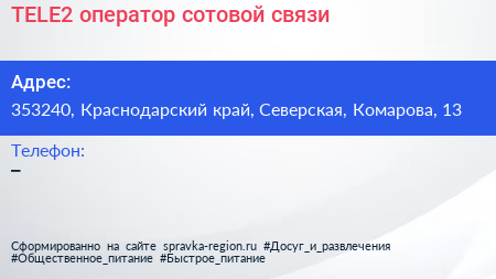 TELE2, оператор сотовой связи по адресу 353240, Краснодарский край, Северская, Комарова, 13 в дальнейшем Организация, размещена в следующих категориях: