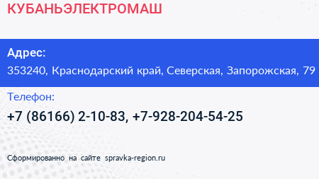 КУБАНЬЭЛЕКТРОМАШ по адресу 353240, Краснодарский край, Северская, Запорожская, 79 в дальнейшем Организация, размещена в следующих категориях: