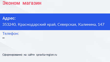 Эконом+, магазин по адресу 353240, Краснодарский край, Северская, Калинина, 147 в дальнейшем Организация, размещена в следующих категориях: