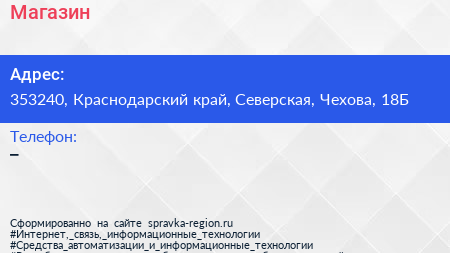 Магазин по адресу 353240, Краснодарский край, Северская, Чехова, 18Б в дальнейшем Организация, размещена в следующих категориях: