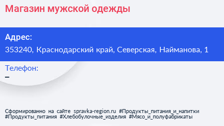 Магазин мужской одежды по адресу 353240, Краснодарский край, Северская, Найманова, 1 в дальнейшем Организация, размещена в следующих категориях: