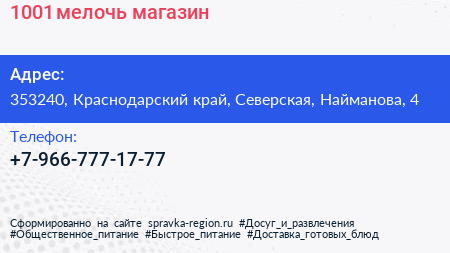 1001 мелочь, магазин по адресу 353240, Краснодарский край, Северская, Найманова, 4 в дальнейшем Организация, размещена в следующих категориях: