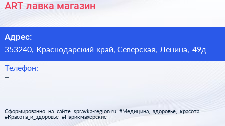 ART-лавка, магазин по адресу 353240, Краснодарский край, Северская, Ленина, 49д в дальнейшем Организация, размещена в следующих категориях: