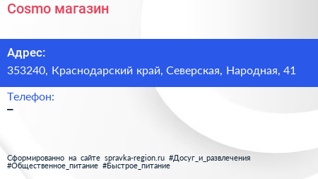 Cosmo, магазин по адресу 353240, Краснодарский край, Северская, Народная, 41 в дальнейшем Организация, размещена в следующих категориях: